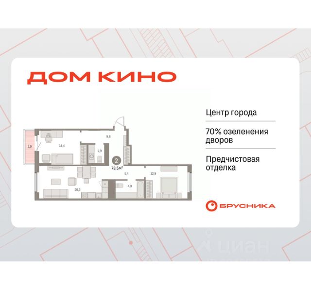 Квартира в счёт первоначального взноса по программе обмена. Информация по телефону, наши менеджеры вам все расскажут! Продается двухкомнатная квартира от застройщика с предчистовой отделкой в ЖК "Дом Кино" на 7 этаже. Общая площадь: 66.27 кв.м., жилая: 24.3 кв.м., площадь просторной кухни-гостиной: 21.1 кв.м. Комнаты изолированные, все окна выходят на одну сторону. В квартире один балкон, один совмещенный и один раздельный санузел. Высота потолков 2.7 м. Дом монолитный, многоподъездный, переменной этажности, от 8 до 15 этажей. Квартира находится в 5-й секции высотой 9 этажей в корпусе 1. На этаже 8 квартир. В подъезде 1 пассажирский и 1 грузовой лифт. Окончание строительства - 1 квартал 2027 года. Оформление сделки по договору долевого участия. Квартира с кухней-гостиной и двумя спальнями в Доме кино. Особенности планировки: второй санузел, разнесённые спальни, предчистовая отделка, балкон. Район Центр города "Дом кино" находится в самом центре Кургана, на пересечении улиц Пролетарская и Карла Маркса. Район насыщен всей необходимой инфраструктурой: здесь есть школы, детские сады, поликлиники, больницы, учреждения культуры и досуга, магазины и рестораны, офисы. Рядом расположены автобусные остановки, поэтому можно быстро добраться в любую часть города без автомобиля. В шаговой доступности от дома находится Курганский государственный университет, художественный музей, библиотека имени Маяковского, филармония, городской сквер и торговый центр "Звёздный". Проект Новая точка притяжения Проект расположен на месте бывшего кинотеатра "Звёздный". В советское время он считался лучшим в области, сотни людей собирались на премьерные кинопоказы. В 2002 году, когда зданию потребовался капитальный ремонт, "Звёздный" был закрыт. В 2012 году кинотеатр снесли, а в 2021 году землю приобрела компания Брусника — под строительство нового проекта, который получил название "Дом кино". Проект представляет собой квартал, разомкнутый в сторону сквера. Архитектура дома идентична исторической застройке района и гармонично вписывается в его панораму. Основная часть здания имеет высотность девять этажей. Башня является доминантой и ориентирована на городской сквер, ее высота 15 этажей. Фасады выполнены в теплой цветовой гамме коричневых и песочных оттенков. Яркой архитектурной деталью проекта станет арка высотой более чем в два этажа. Она раскинется над лестницей, которая ведет напрямую в городской сквер из двора. Двор Двор с выходом в сквер Двор - это приватное пространство для жителей, закрытое от машин. В нём спроектированы детская и спортивная площадки, выполненные из натуральных материалов, а также зоны отдыха. Прямой выход в городской сквер расширяет функционал двора. Жители смогут быстро попадать в общественную зону с фонтаном, детскими и спортивными площадками и местами для отдыха. Большую часть территории двора занимает зелень. Озеленение выполнено в стиле пэчворк, и вдохновлено техникой лоскутного шитья. Отдельные фрагменты ландша
