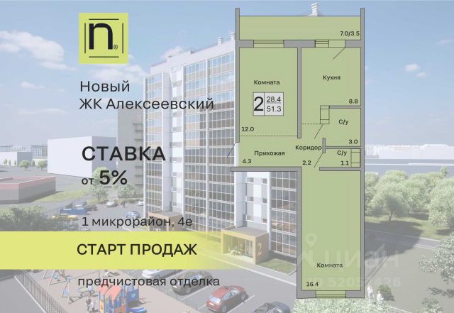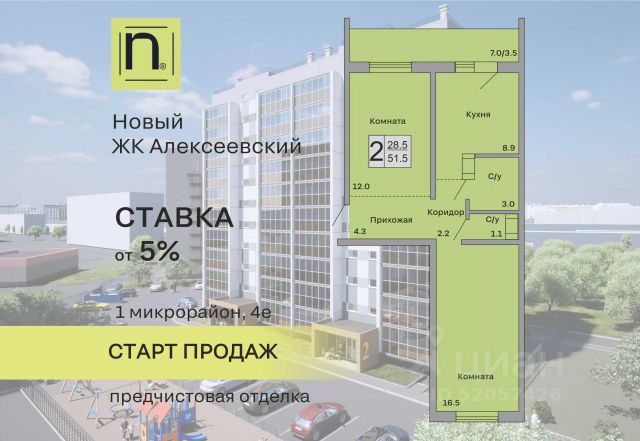 Продаётся 2-комнатная квартира в строящемся доме (Дом 1), срок сдачи: III-кв. 2027, общей площадью 51.3 кв.м., на 6 этаже. Новый жилой комплекс "Алексеевский" от застройщика "ГК Кургансельстрой" расположен по адресу: г. Курган, жилой район Заозёрный, 1-й микрорайон, улица Алексеева.