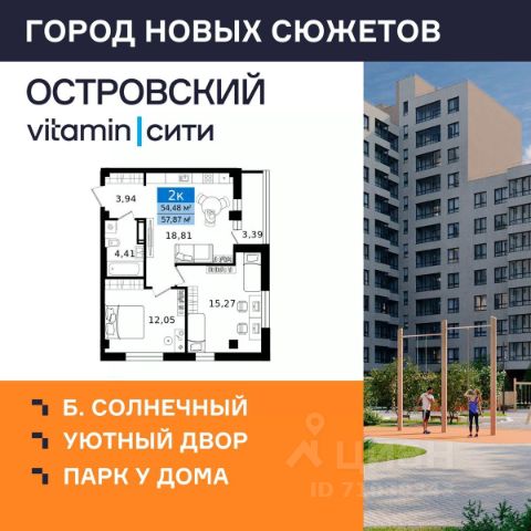 "Островский vitamin-сити" — город новых сюжетов на бульваре Солнечном Масштабный проект комплексной застройки территории в динамично развивающемся районе Кургана, вблизи парка "Царёво городище". На территории комплекса запланированы жилые дома с уникальными планировками, благоустроенные дворы без машин, просторные парковки, прогулочные зоны и полноценная инфраструктура для всей семьи. Почему выбирают ЖК "Островский vitamin-сити"? Уникальная локация: жилой комплекс расположен в тихом и живописном месте, всего в 10 минутах от центра города. Парк "Семи островов": визитной карточкой проекта станет уникальное пространство площадью более 2,5 Га для прогулок и тренировок на свежем воздухе в шаговой доступности от дома. Дворы нового уровня: полностью безопасные, с игровыми элементами, разработанными по методике нейрофизиологов, богатым озеленением и удобными зонами отдыха для всей семьи. Надежность и качество: дома строятся по технологии КУБ 2,5, обеспечивающей надежность, долговечность и высокую энергоэффективность. Фасады домов выполнены в стильных натуральных природных оттенках. Не просто подъезды: в холлах зоны ожидания, колясочные, лапомойки и комнаты гигиены. Благодаря прозрачным входным группам в подъездах всегда будет светло и просторно. Продуманные планировки: вы можете подобрать квартиру, которая подходит именно вам сити-хаусы, квартиры-трансформеры, отсутствие несущих стен дают возможности для разных сценариев жизни. Выбор отделки: квартиры сдаются в предчистовой отделке, которая включает оштукатуренные стены, стяжку пола, установленные радиаторы отопления и окна ПВХ, электропроводку до квартирного щитка, выделенные мокрые зоны в санузлах. Также есть возможность приобрести чистовую отделку, включив её стоимость в ипотеку. Условия покупки: Действует беспроцентная рассрочка, а также выгодные спецпредложения и акции! Сроки сдачи: Первая очередь ЖК "Островский" будет сдана во II квартале 2027 года.