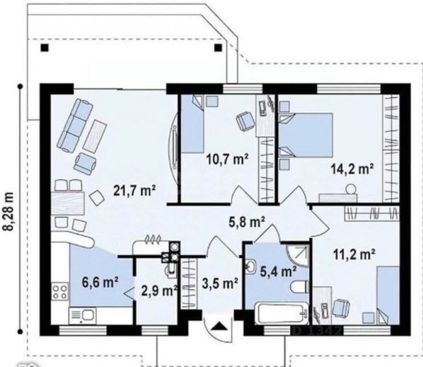 Площадь дома 124 квадрата: две комнаты на первом этаже каждая по 16,7 кв.м. , свободная планировка на втором этаже 30 кв.м., кухня 13,8 кв.м., сан узел 5,4 кв.м., коридор, терасса (веранда) 14,2 кв.м., котельная 5 кв.м. Планировка дома есть на фото.