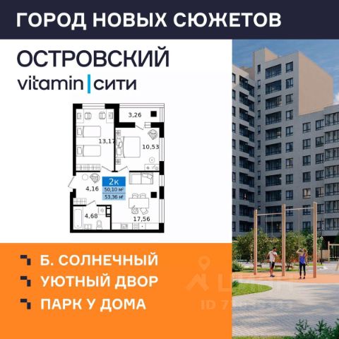 "Островский vitamin-сити" — город новых сюжетов на бульваре Солнечном Масштабный проект комплексной застройки территории в динамично развивающемся районе Кургана, вблизи парка "Царёво городище". На территории комплекса запланированы жилые дома с уникальными планировками, благоустроенные дворы без машин, просторные парковки, прогулочные зоны и полноценная инфраструктура для всей семьи. Почему выбирают ЖК "Островский vitamin-сити"? Уникальная локация: жилой комплекс расположен в тихом и живописном месте, всего в 10 минутах от центра города. Парк "Семи островов": визитной карточкой проекта станет уникальное пространство площадью более 2,5 Га для прогулок и тренировок на свежем воздухе в шаговой доступности от дома. Дворы нового уровня: полностью безопасные, с игровыми элементами, разработанными по методике нейрофизиологов, богатым озеленением и удобными зонами отдыха для всей семьи. Надежность и качество: дома строятся по технологии КУБ 2,5, обеспечивающей надежность, долговечность и высокую энергоэффективность. Фасады домов выполнены в стильных натуральных природных оттенках. Не просто подъезды: в холлах зоны ожидания, колясочные, лапомойки и комнаты гигиены. Благодаря прозрачным входным группам в подъездах всегда будет светло и просторно. Продуманные планировки: вы можете подобрать квартиру, которая подходит именно вам сити-хаусы, квартиры-трансформеры, отсутствие несущих стен дают возможности для разных сценариев жизни. Выбор отделки: квартиры сдаются в предчистовой отделке, которая включает оштукатуренные стены, стяжку пола, установленные радиаторы отопления и окна ПВХ, электропроводку до квартирного щитка, выделенные мокрые зоны в санузлах. Также есть возможность приобрести чистовую отделку, включив её стоимость в ипотеку. Условия покупки: Действует беспроцентная рассрочка, а также выгодные спецпредложения и акции! Сроки сдачи: Первая очередь ЖК "Островский" будет сдана во II квартале 2027 года.