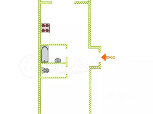 Комната - изолированная, санузел - совмещенный.Окна выходят на одну сторону дома, во двор.