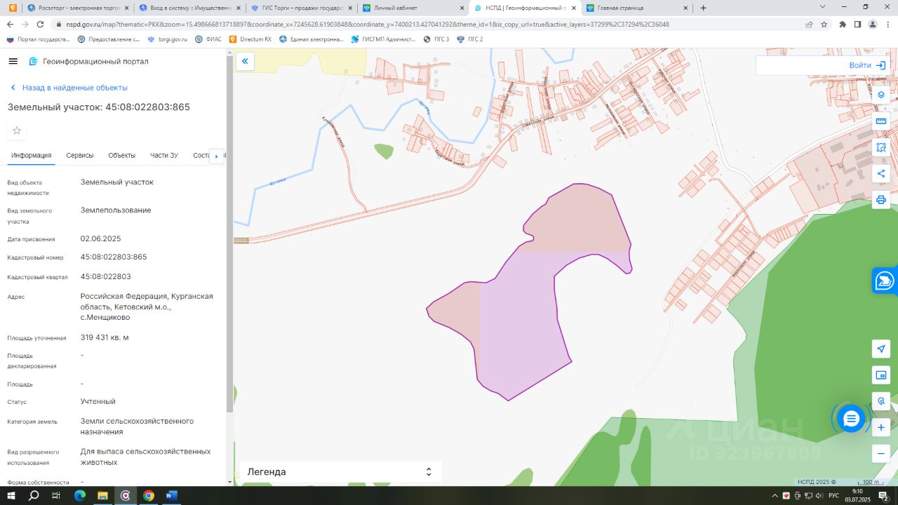 - кадастровый номер 45:08:022803:865; - вид разрешенного использования для выпаса сельскохозяйственных животных; - категория земель: Земли сельскохозяйственного назначения; - площадь 319431 кв.м.