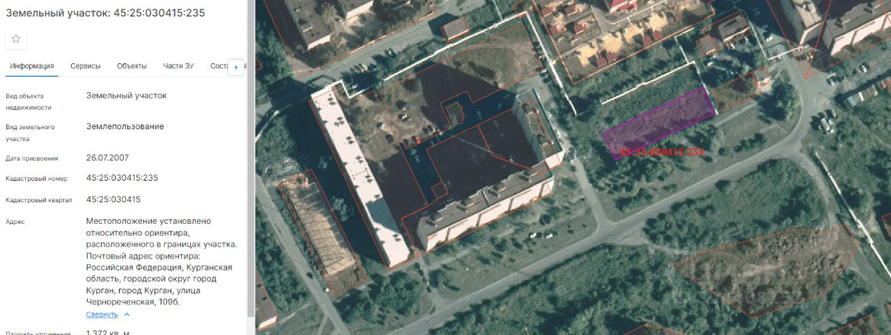 Земельный участок с кадастровым номером 45:25:030415:235, площадью 1372 кв.м, с разрешенным использованием - магазины, расположенный по адресу: г. Курган, ул. Чернореченская, 109б