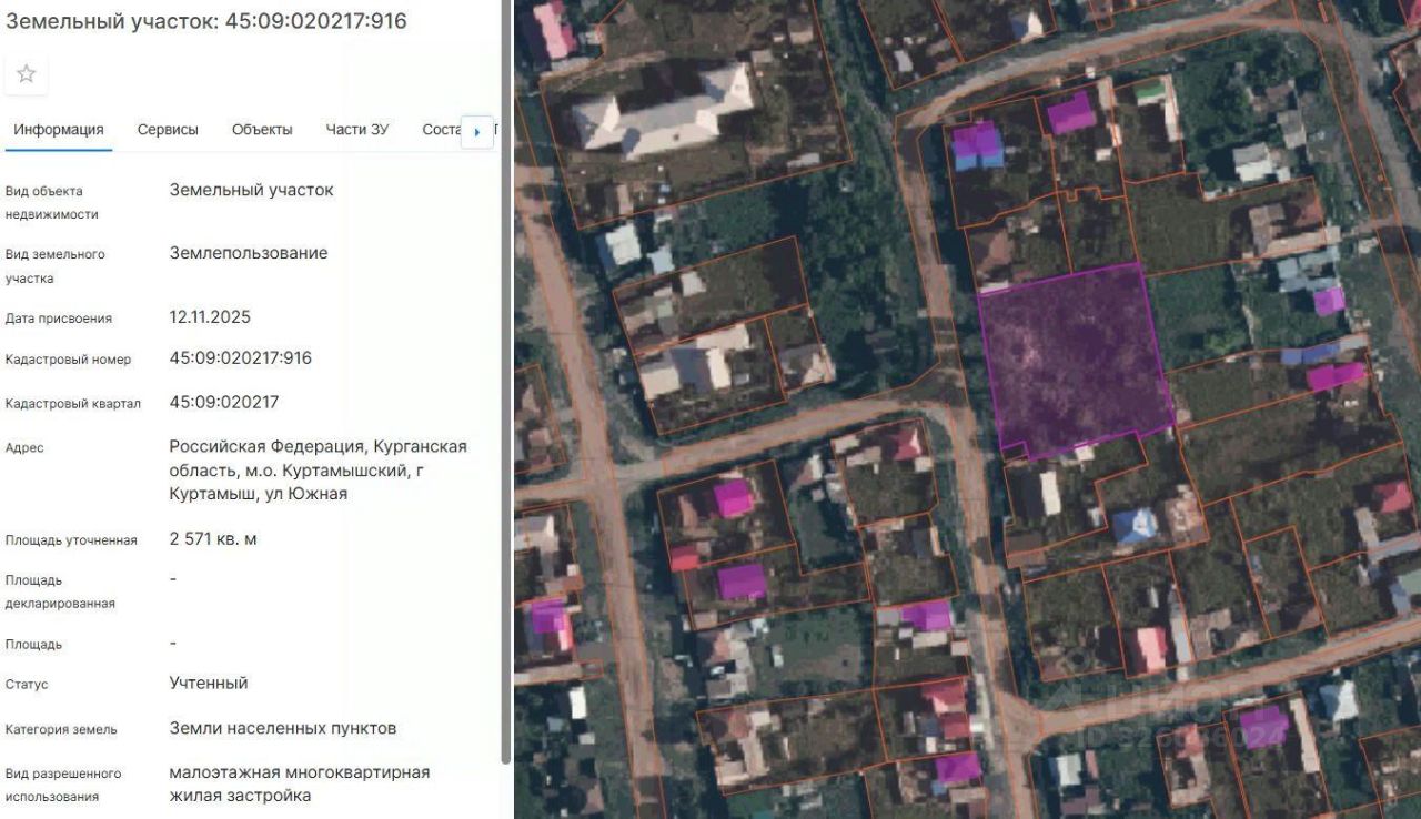 Земельный участок с кадастровым номером 45:09:020217:916, площадью 2571 кв.м., из земель населенных пунктов, расположенный по адресу (местоположение): Российская Федерация, Курганская область, м.о. Куртамышский, г. Куртамыш, ул. Южная, вид разрешенного использования "малоэтажная многоквартирная жилая застройка"