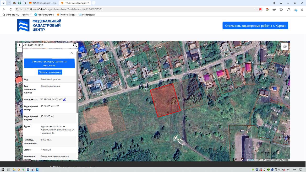 Курганская область, р-н Юргамышский, р.п. Юргамыш, ул. Парковая, 18, общей площадью 3000 кв.м., с кадастровым номером 45:24:020101:1226, из земель населенных пунктов с разрешенным видом использования — для размещения среднеэтажного жилого дома.