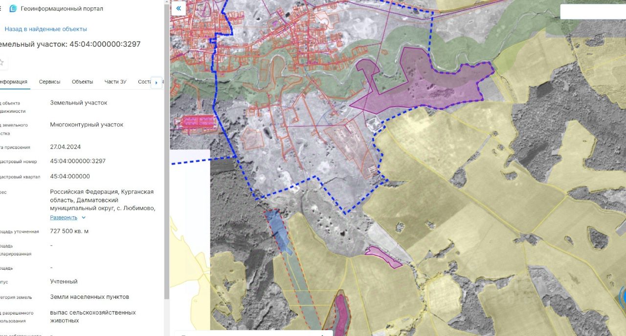 Аукцион в электронной форме на право заключения договора аренды земельного участка из земель населенных пунктов, государственная собственность, на которые не разграничена площадью 727500 кв.м., с кадастровым номером 45:04:000000:3297 местоположение: Российская Федерация, Курганская область, Далматовский муниципальный округ, с. Любимово, северо- восточная часть села, разрешенное использование выпас сельскохозяйственных животных