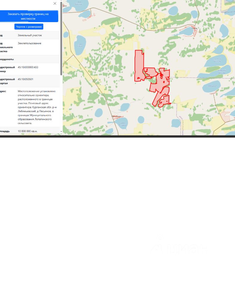 Земельный участок с кадастровым номером 45:10:000000:433 площадь 10800000 по адресу Курганская обл, р-н Лебяжьевский, д Песьяное, в границах Муниципального образования Лопатинского сельсовета
