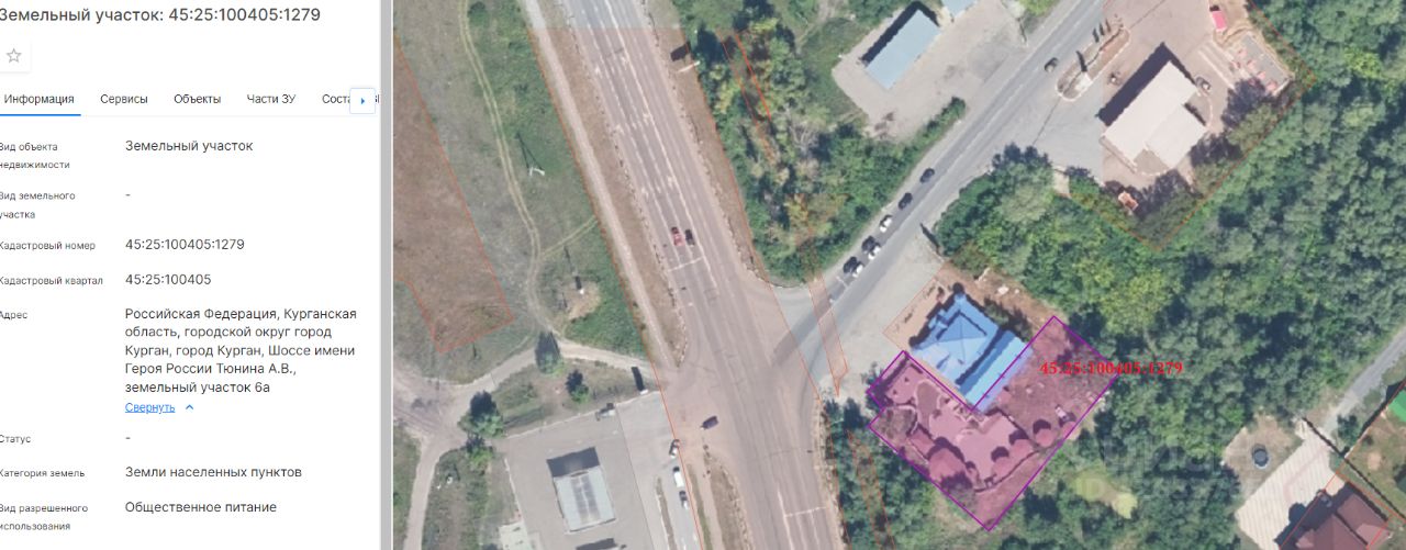 земельный участок с кадастровым номером 45:25:100405:1279, площадью 1716 кв. м, с разрешенным использованием - общественное питание, расположенный по адресу: г. Курган, шоссе им. Героя России Тюнина А.В., участок 6а
