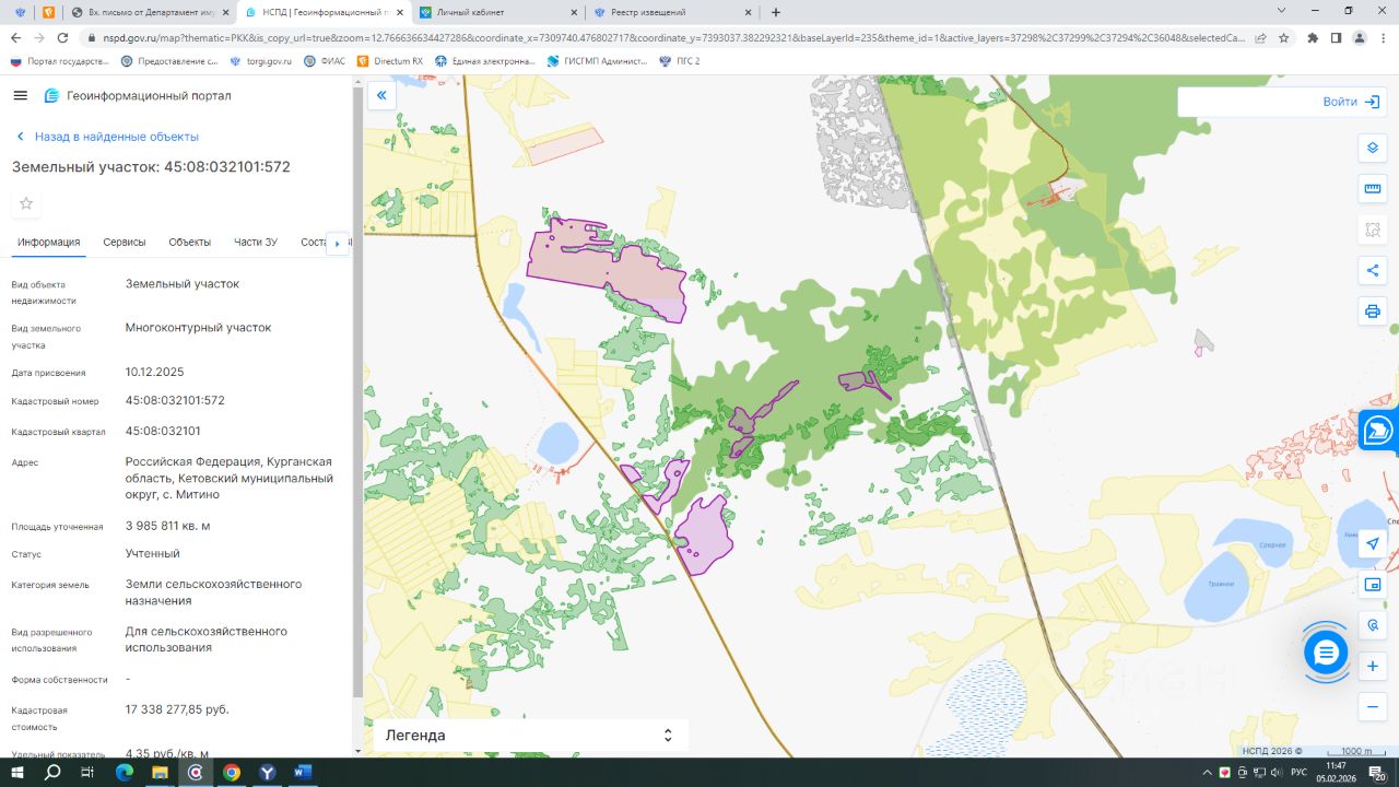 - кадастровый номер 45:08:032101:572; - вид разрешенного использования для сельскохозяйственного использования; - категория земель: земли сельскохозяйственного назначения; - площадь 3985811 кв.м.; - ограничения (обременения) права: отсутствуют.