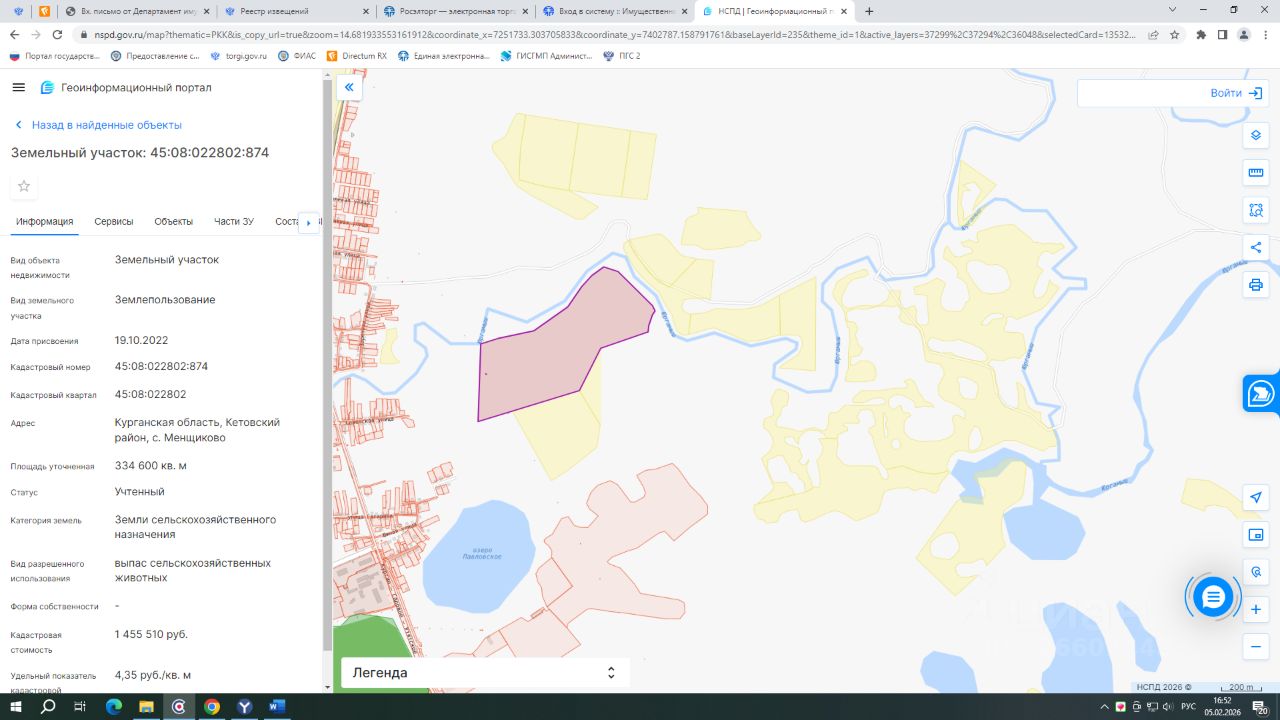 - кадастровый номер 45:08:022802:874; - вид разрешенного использования для сельскохозяйственного использования; - категория земель: выпас сельскохозяйственных животных; - площадь 334600 кв.м.