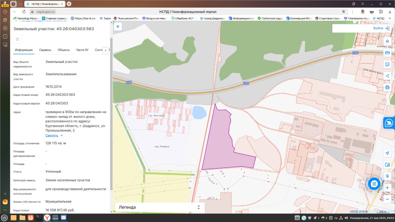 Лот 1. Продажа права на заключение договора аренды земельного участка муниципальной собственности с кадастровым номером 45:26:040303:563 площадью 128115 кв.метров с разрешенным использованием для производственной деятельности, с местоположением: примерно в 600 м по направлению на северо-запад от жилого дома, расположенного по адресу: Курганская область, г.Шадринск, ул. Промышленная, 2. Границы определены в соответствии с федеральными законами.