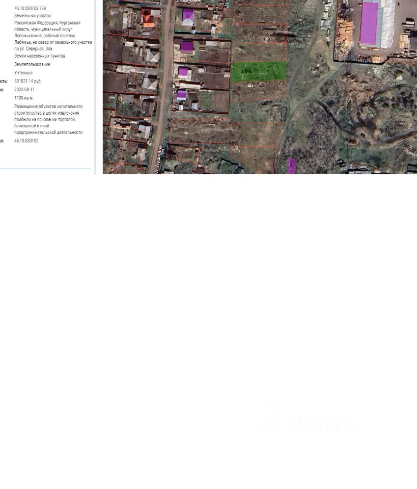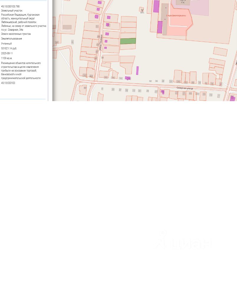 Земельный участок с кадастровым номером 45:10:030103:798 площадь 1109 по адресу Российская Федерация, Курганская область, муниципальный округ Лебяжьевский, рабочий поселок Лебяжье, на север от земельного участка по ул. Северная, 34а