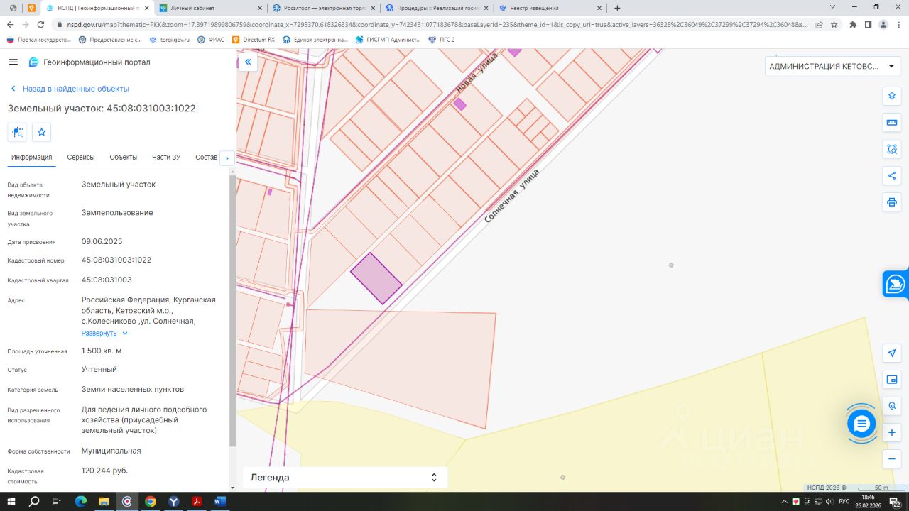 - кадастровый номер 45:08:031003:1022; - вид разрешенного использования земли населенных пунктов; - категория земель: для ведения личного подсобного хозяйства (приусадебный земельный участок); - площадь 1500 кв.м.