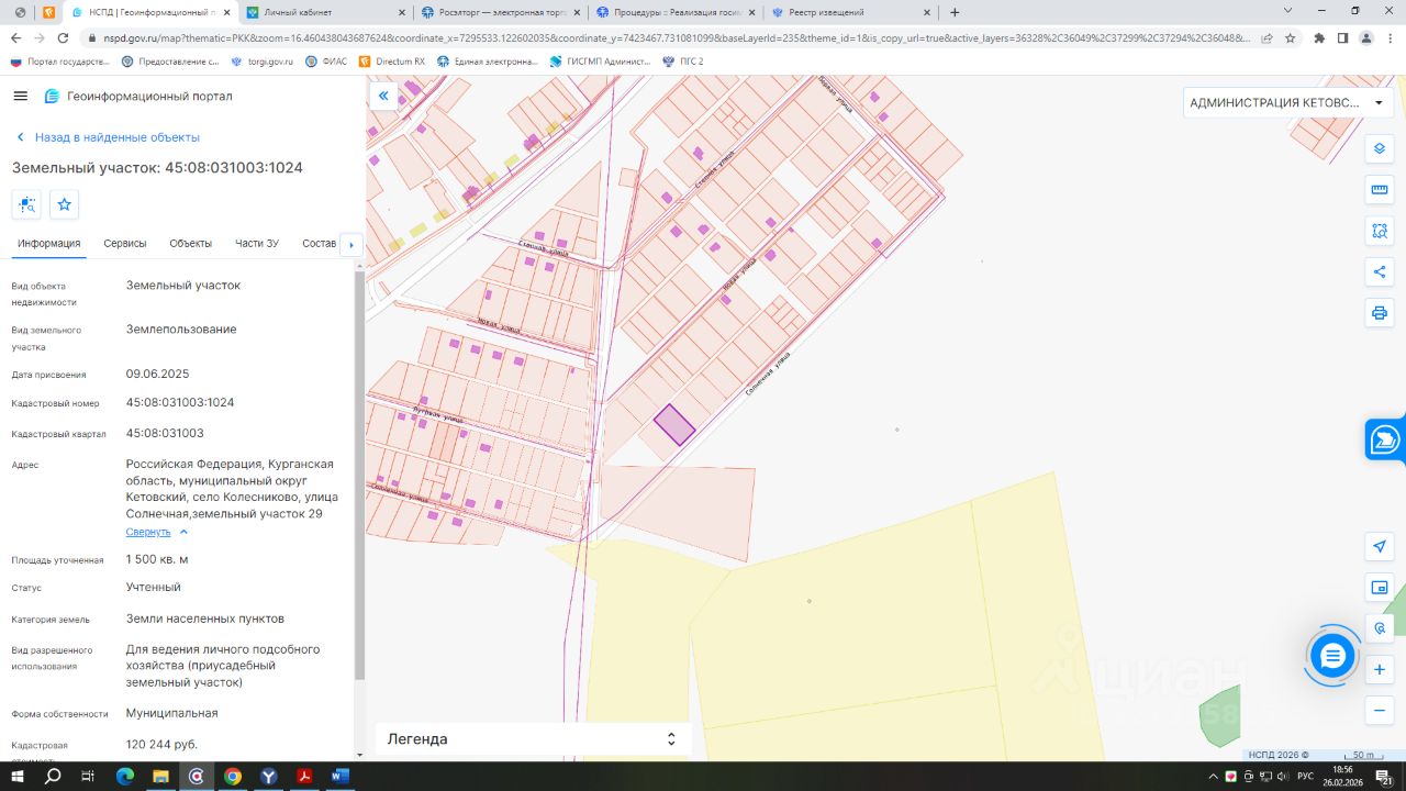 - кадастровый номер 45:08:031003:1024; - вид разрешенного использования земли населенных пунктов; - категория земель: для ведения личного подсобного хозяйства (приусадебный земельный участок); - площадь 1500 кв.м.