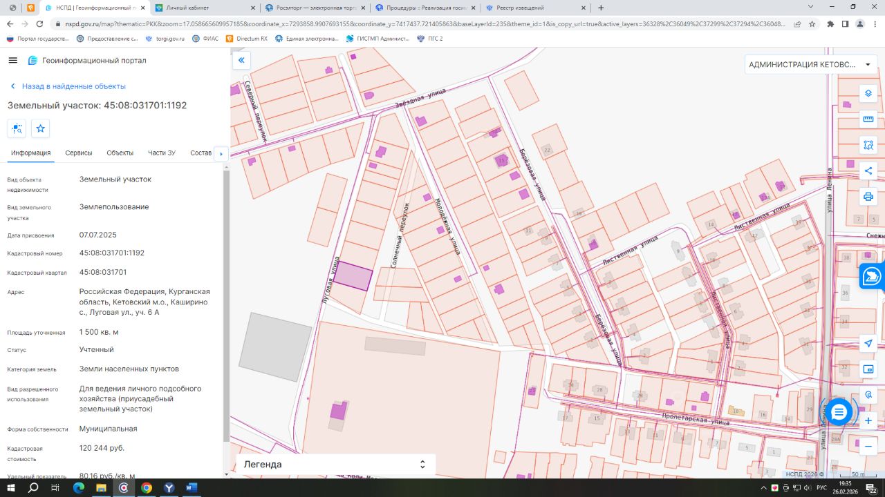 - кадастровый номер 45:08:031701:1192; - вид разрешенного использования земли населенных пунктов; - категория земель: для ведения личного подсобного хозяйства (приусадебный земельный участок); - площадь 1500 кв.м.