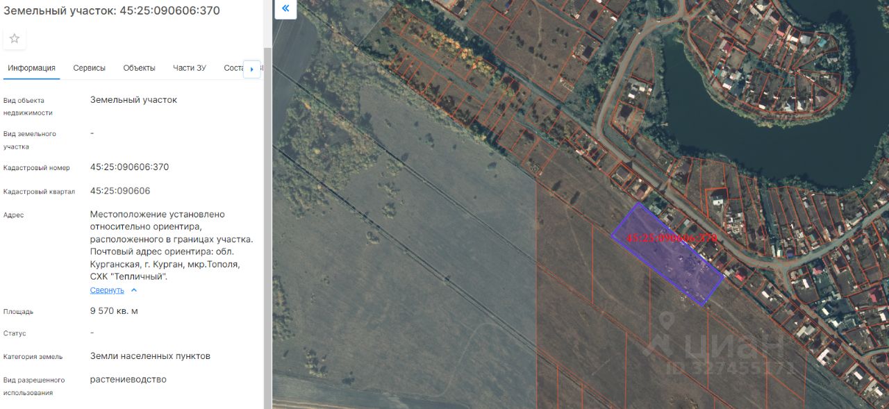земельный участок с кадастровым номером 45:25:090606:370, площадью 9570 кв. м, с разрешенным использованием - растениеводство, расположенный по адресу: г. Курган, мкр. Тополя, СХК "Тепличный"