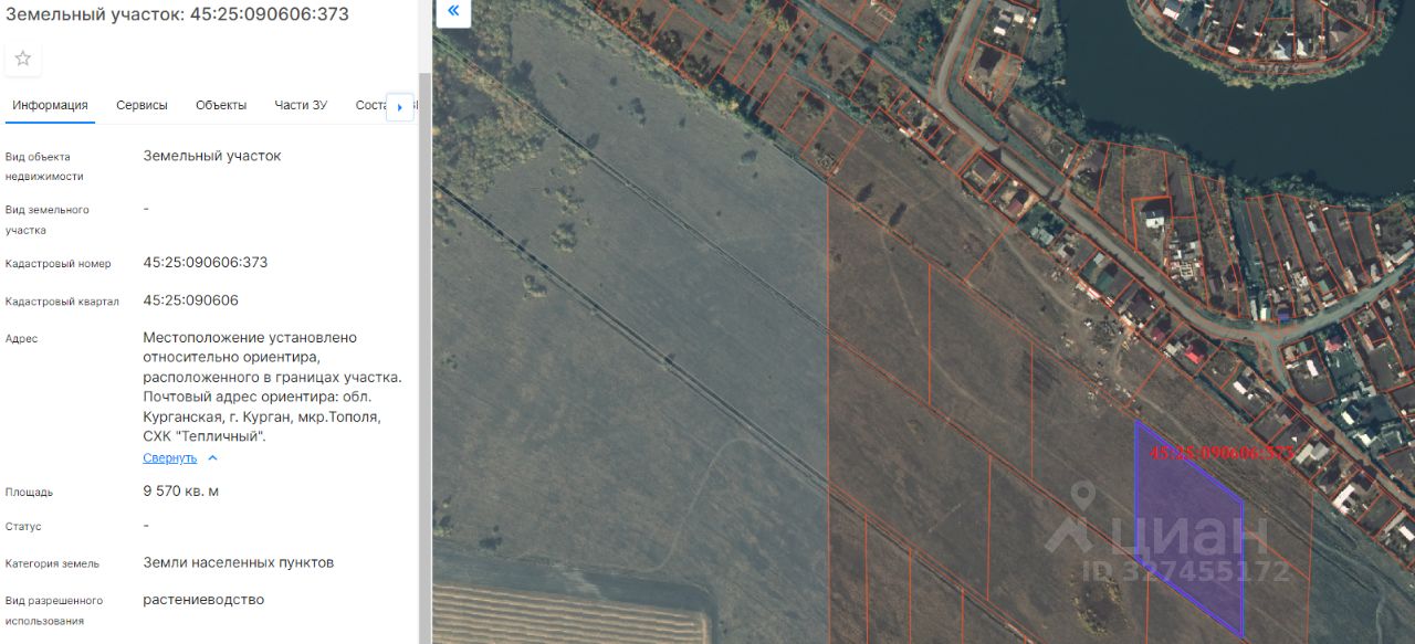 земельный участок с кадастровым номером 45:25:090606:373, площадью 9570 кв. м, с разрешенным использованием - растениеводство, расположенный по адресу: г. Курган, мкр. Тополя, СХК "Тепличный"
