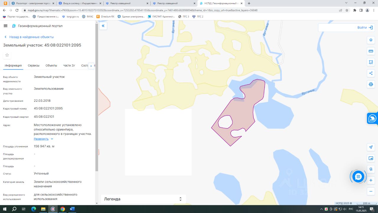 - кадастровый номер 45:08:022101:2095; - вид разрешенного использования для сельскохозяйственного использования; - категория земель: земли сельскохозяйственного назначения; - площадь 156947 кв.м.