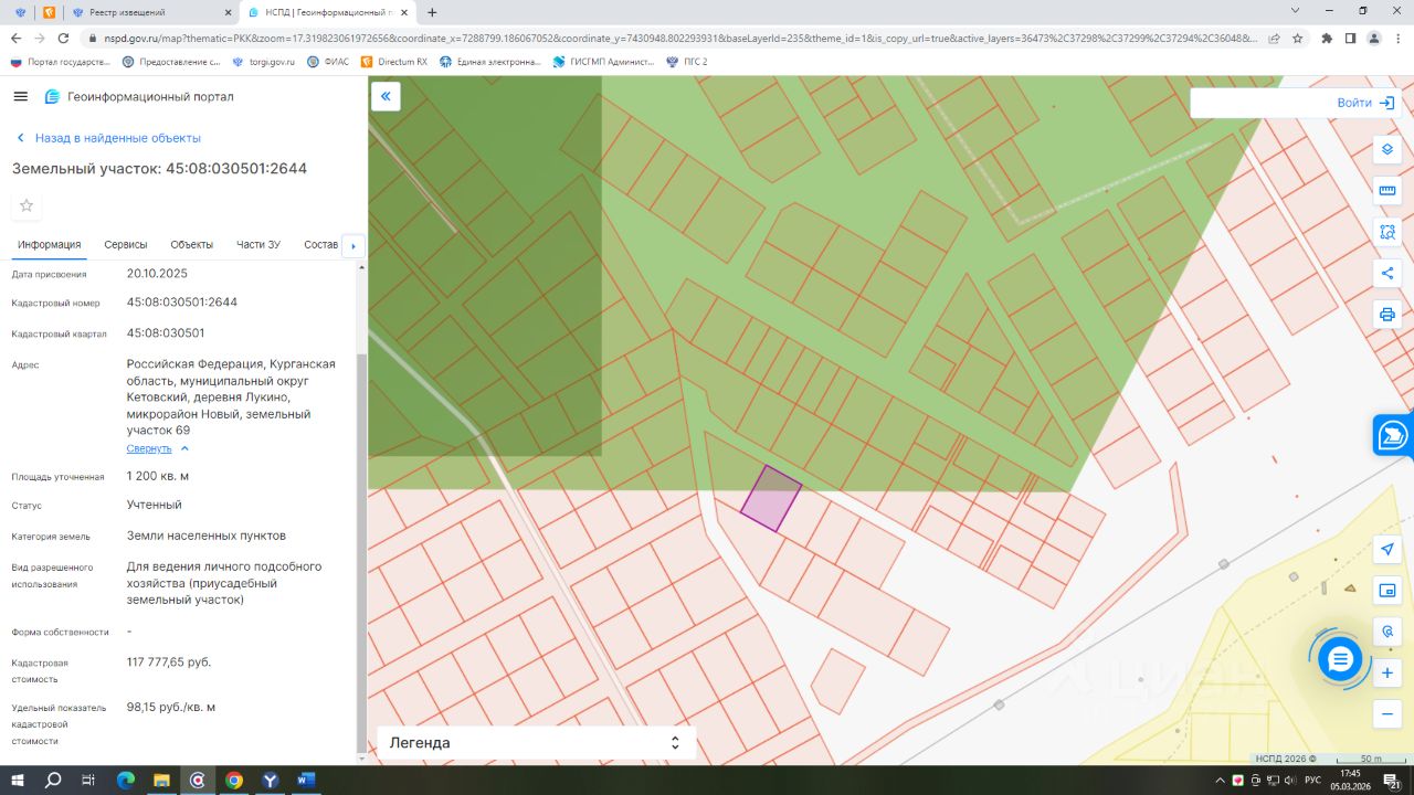 - кадастровый номер 45:08:030501:2644; - вид разрешенного использования земли населенных пунктов; - категория земель: для ведения личного подсобного хозяйства (приусадебный земельный участок); - площадь 1200 кв.м.