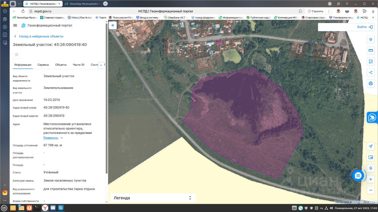 Лот 10. Продажа права на заключение договора аренды земельного участка государственной собственности с кадастровым номером 45:26:090419:40 площадью 87196 кв.метров с разрешенным использованием для строительства парка отдыха, по адресу: местоположение установлено относительно ориентира, расположенного за пределами участка, почтовый адрес ориентира: Курганская обл., г.Шадринск, примерно в 105 м юго-западнее жилого дома 1 по ул. Кирпичная. Границы определены в соответствии с федеральными законами.