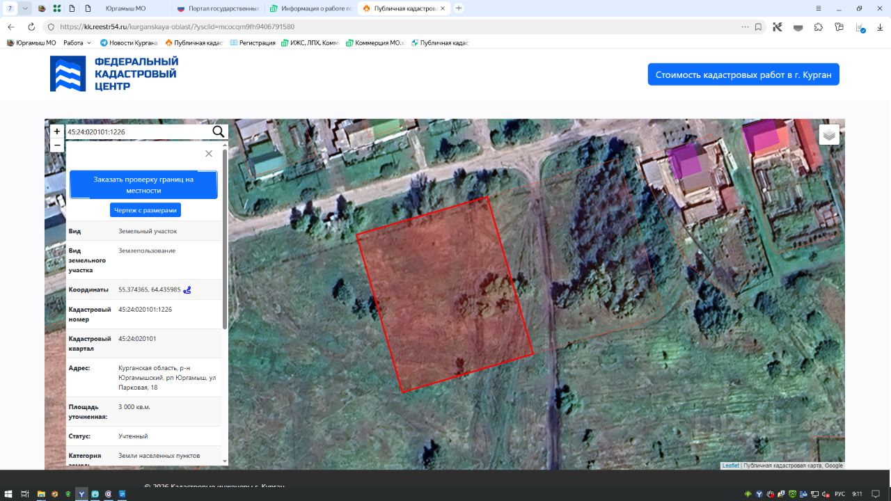 Курганская область, р-н Юргамышский, р.п. Юргамыш, ул. Парковая, 18, общей площадью 3000 кв.м., с кадастровым номером 45:24:020101:1226, из земель населенных пунктов с разрешенным видом использования — для размещения среднеэтажного жилого дома.
