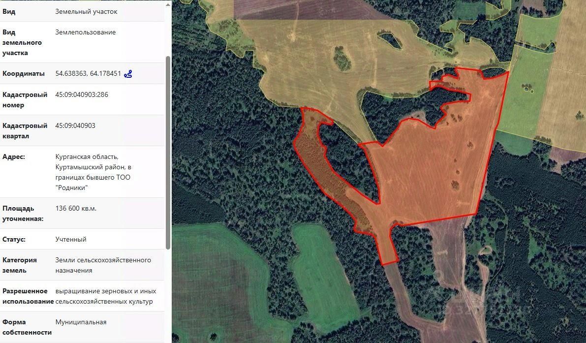 Земельный участок с кадастровым номером 45:09:040903:286, площадью 136600 кв.м, из земель сельскохозяйственного назначения, расположенный по адресу (местоположение): Курганская область, Куртамышский район, в границах бывшего ТОО "Родники", вид разрешенного использования "Выращивание зерновых и иных сельскохозяйственных культур".