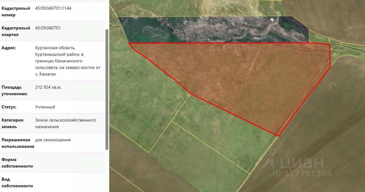 Земельный участок с кадастровым номером 45:09:040701:1144, площадью 212924 кв.м, из земель сельскохозяйственного назначения, расположенный по адресу (местоположение): Курганская область, Куртамышский район, в границах Камаганского сельсовета, на северо-восток от с. Камаган, вид разрешенного использования "для сенокошения".