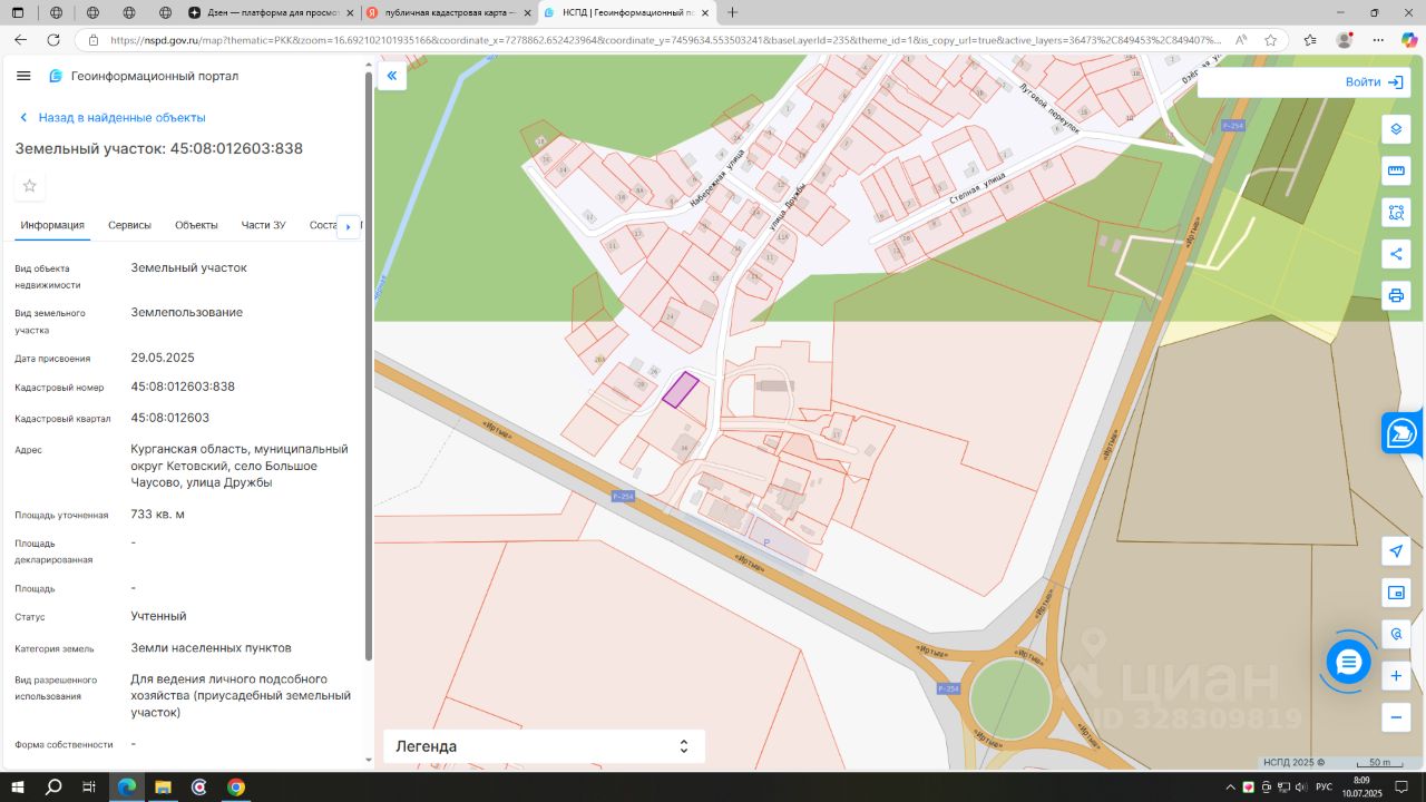 - кадастровый номер 45:08:012603:838; - вид разрешенного использования для ведения личного подсобного хозяйства (приусадебный земельный участок); - категория земель: земли населенных пунктов; - площадь 733 кв.м.