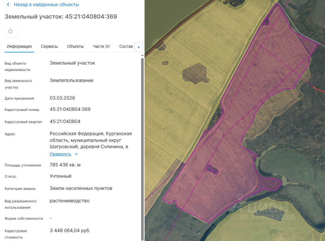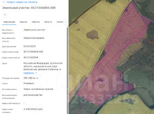 Земельный участок с кадастровым номером 45:21:040804:369 площадь 785436 по адресу Российская Федерация, Курганская область, муниципальный округ Шатровский, деревня Сопинина, в 200 м. западнее д. Сопинина