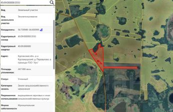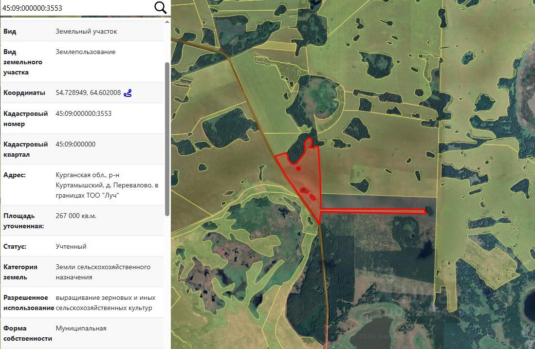 Земельный участок с кадастровым номером 45:09:000000:3553, площадью 103000 кв.м, из земель сельскохозяйственного назначения, расположенный по адресу (местоположение): Курганская обл., р-н Куртамышский, д. Перевалово, в границах ТОО "Луч", вид разрешенного использования "выращивание зерновых и иных сельскохозяйственных культур"