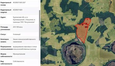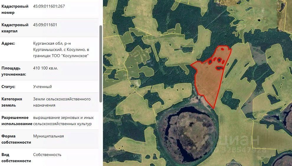 Земельный участок с кадастровым номером 45:09:011601:267, площадью 410100 кв.м, из земель сельскохозяйственного назначения, расположенный по адресу (местоположение): Курганская обл, р-н Куртамышский, с Косулино, в границах ТОО "Косулинское", вид разрешенного использования "выращивание зерновых и иных сельскохозяйственных культур"