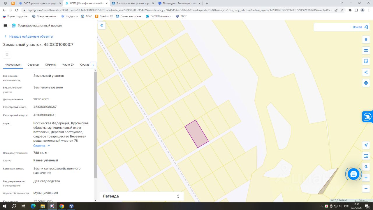 - кадастровый номер 45:08:010803:7; - вид разрешенного использования для садоводства; - категория земель: земли сельскохозяйственного назначения; - площадь 788 кв.м.
