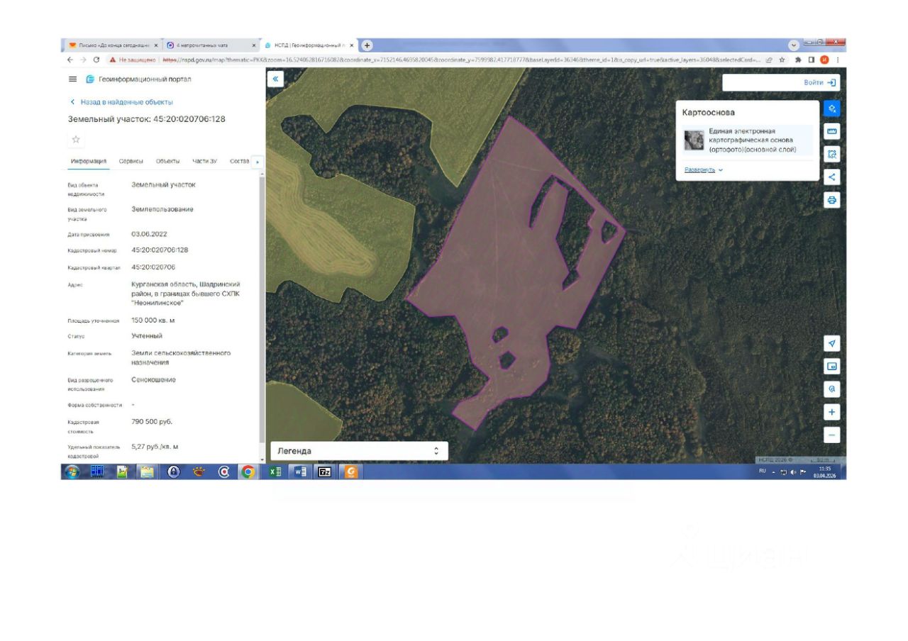 Земельный участок с кадастровым номером 45:20:020706:128, площадью 150000 кв. м, адрес (местоположение): Курганская область, Шадринский район, в границах бывшего СХПК "Неонилинское", категория земель земли сельскохозяйственного назначения, разрешенное использование: "сенокошение".