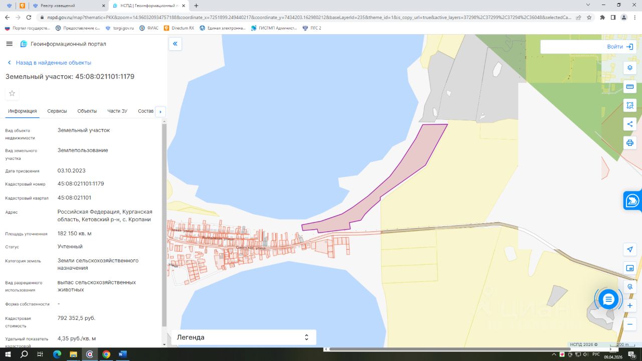 - кадастровый номер 45:08:021101:1179; - вид разрешенного использования выпас сельскохозяйственных животных; - категория земель: земли сельскохозяйственного назначения; - площадь 182150 кв.м.