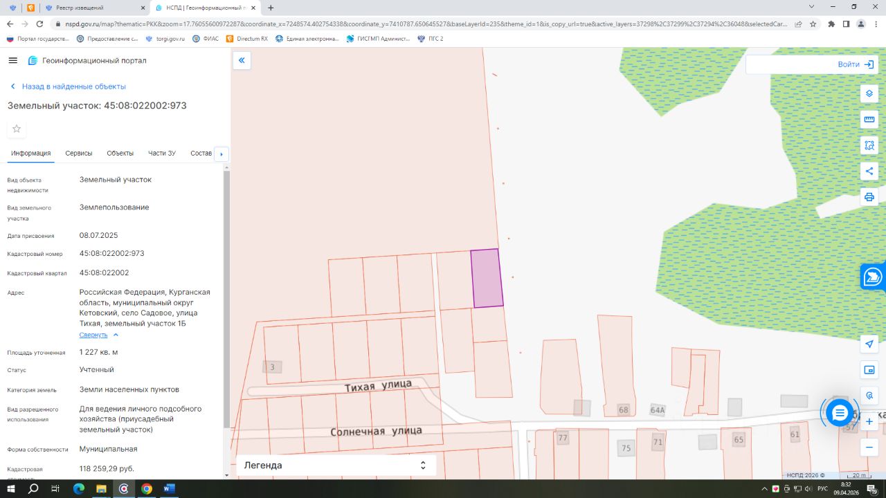 - кадастровый номер 45:08:022002:973; - вид разрешенного использования для ведения личного подсобного хозяйства (приусадебный земельный участок); - категория земель: земли населенных пунктов; - площадь 1227 кв.м.