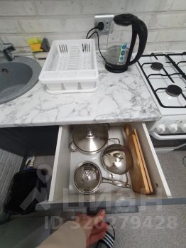 Кухонный гарнитур укомплектован всем необходимым: посуда, столовые приборы, кастрюли, сковороды.