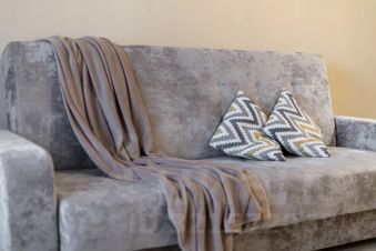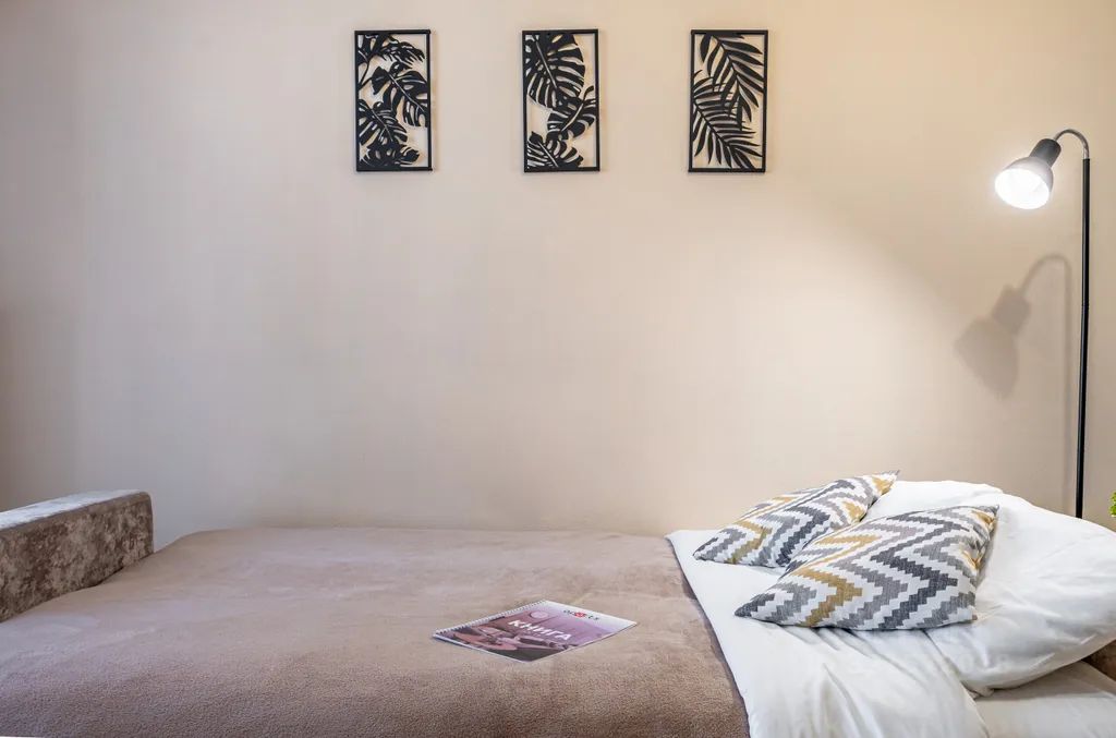 Комфортный двуспальный диван с чистым белым постельным бельём для крепкого сна.
