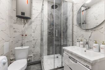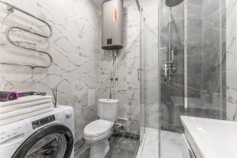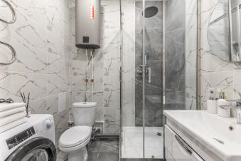 Душевая кабина + свежие полотенца, фен, утюг, водонагреватель.