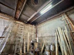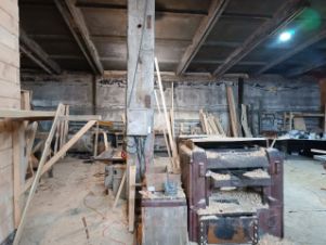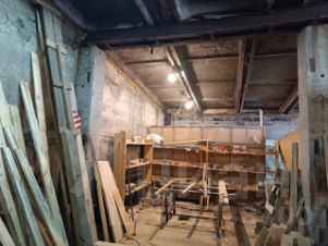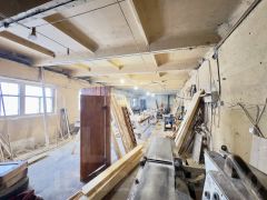 Общая площадь столярной мастерской составляет 196,3 м², а гаража — 447,8 м². Помещения расположены в одноэтажных зданиях, построенных из надежных материалов: плит и частично кирпича, что обеспечивает долговечность и устойчивость. Высота потолков варьируется от 3,5 до 4 метров, что создает комфортные условия для работы и размещения оборудования.