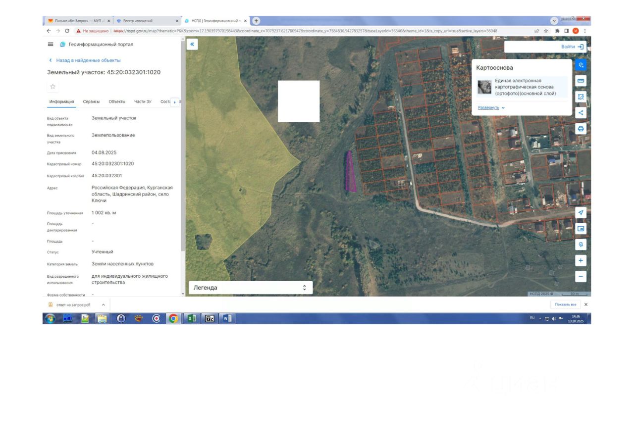 Земельный участок из земель неразграниченной государственной собственности с кадастровым номером 45:20:032301:1020, площадью 1002 кв. м, адрес: Российская Федерация, Курганская область, муниципальный округ Шадринский, село Ключи, категория земель земли населенных пунктов, разрешенное использование: "для индивидуального жилищного строительства"