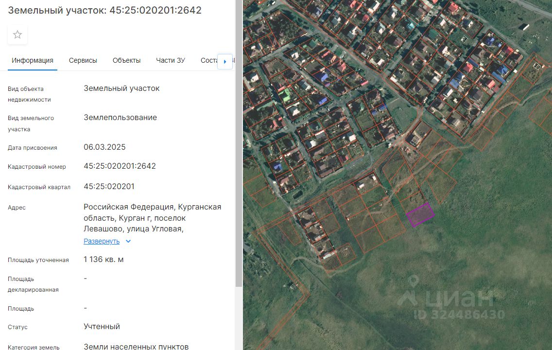 земельный участок с кадастровым номером 45:25:020201:2642, площадью 1136 кв. м, с разрешенным использованием - для индивидуального жилищного строительства, расположенный по адресу: г. Курган, пос. Левашово, ул. Угловая, участок 15