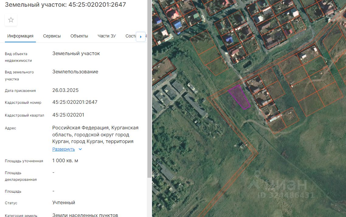 земельный участок с кадастровым номером 45:25:020201:2647, площадью 1000 кв. м, с разрешенным использованием - для индивидуального жилищного строительства, расположенный по адресу: г. Курган, пос. Левашово, ул. Угловая, участок 2