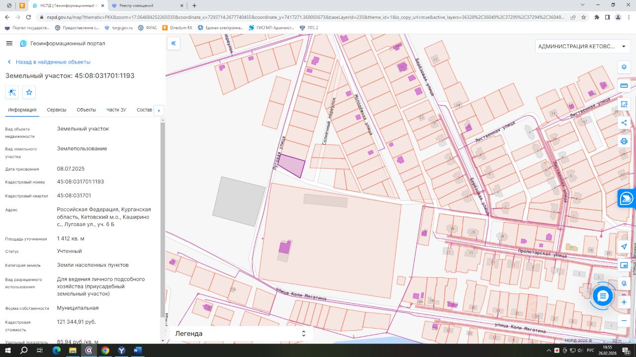 - кадастровый номер 45:08:031701:1193; - вид разрешенного использования Для ведения личного подсобного хозяйства (приусадебный земельный участок); - категория земель: Земли сельскохозяйственного назначения; - площадь 1412 кв.м.