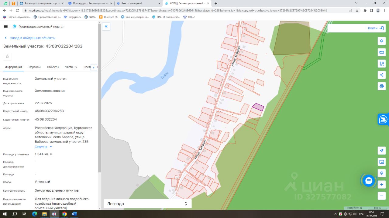 - кадастровый номер 45:08:032204:283; - вид разрешенного использования для ведения личного подсобного хозяйства (приусадебный земельный участок); - категория земель: земли населенных пунктов; - площадь 1344 кв.м.