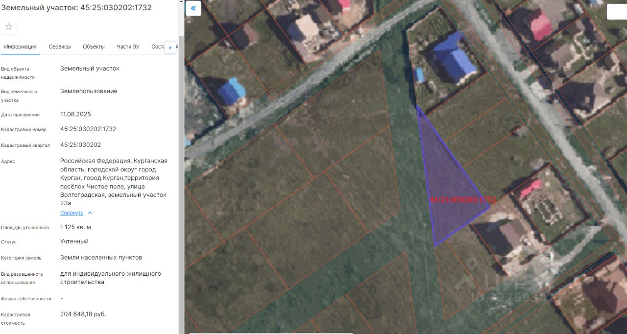 земельный участок с кадастровым номером 45:25:030202:1732 площадью 1125 кв. м, с разрешенным использованием - для индивидуального жилищного строительства, расположенный по адресу: г. Курган, пос. Чистое поле, ул. Волгоградская, участок 23а