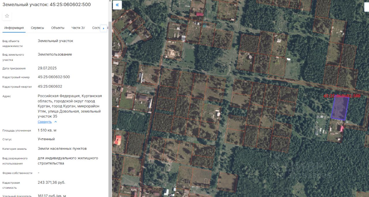 земельный участок с кадастровым номером 45:25:060602:500, площадью 1510 кв. м, с разрешенным использованием - для индивидуального жилищного строительства, расположенный по адресу: г. Курган, мкр. Утяк, ул. Довольная, участок 35