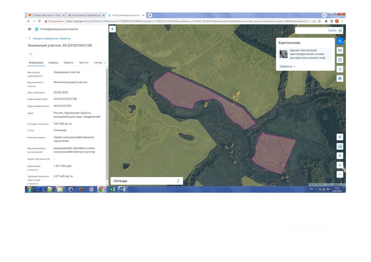 Земельный участок с кадастровым номером 45:20:021303:138, площадью 250000 кв. м, адрес (местоположение): Российская Федерация, Курганская область, муниципальный округ Шадринский, категория земель земли сельскохозяйственного назначения, разрешенное использование: "выращивание зерновых и иных сельскохозяйственных культур".