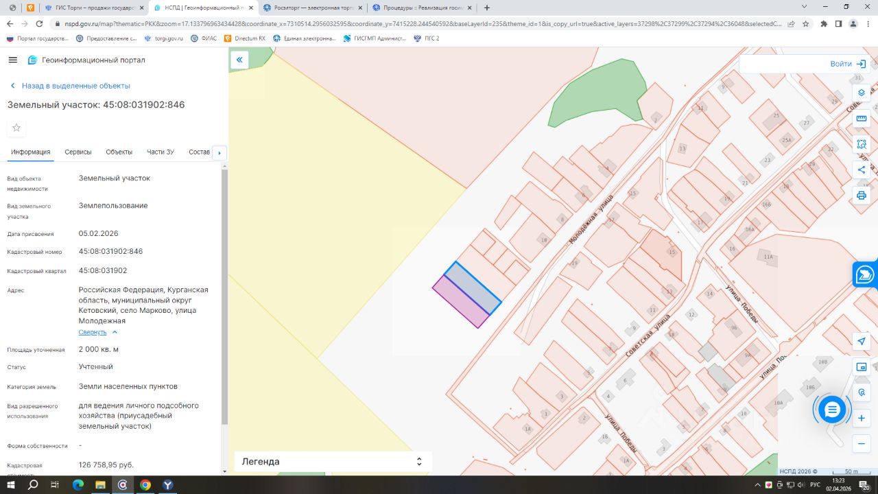 - кадастровый номер 45:08:031902:846; - вид разрешенного использования для ведения личного подсобного хозяйства (приусадебный земельный участок); - категория земель: земли населенных пунктов; - площадь 2000 кв.м.