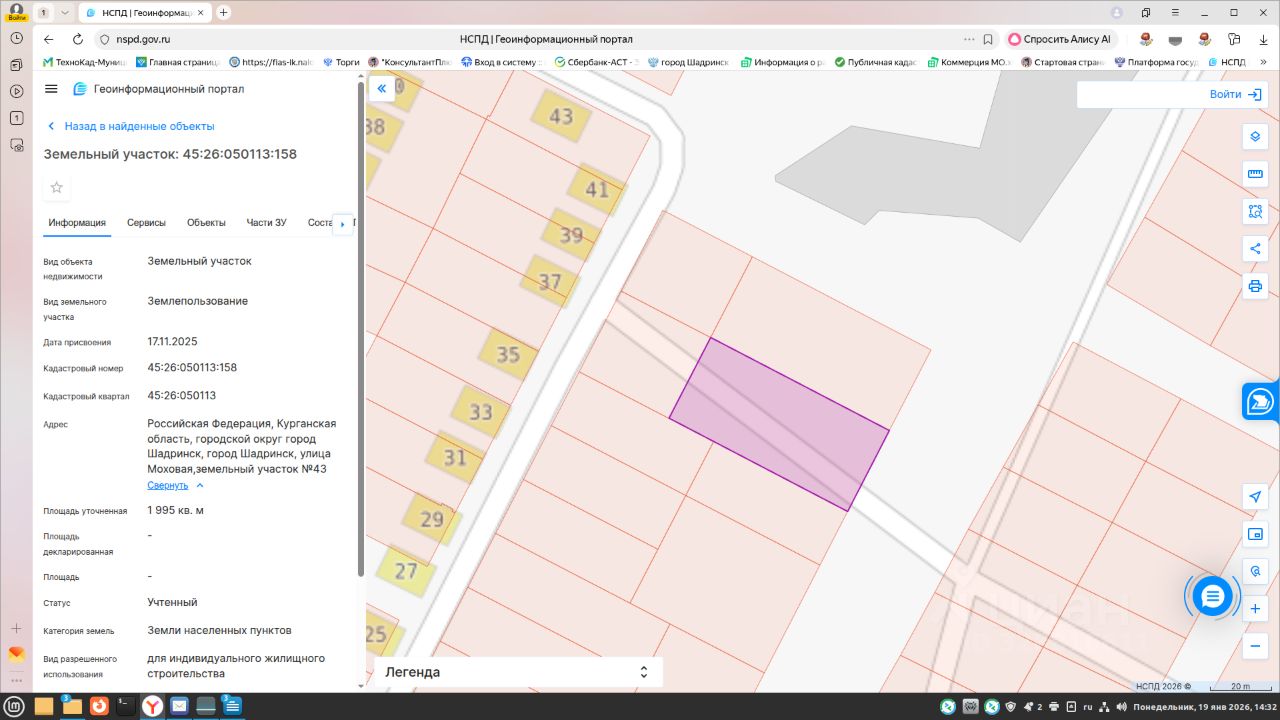 Лот 3. Продажа земельного участка государственной собственности с кадастровым номером 45:26:050113:158 площадью 1995 кв.метров с разрешенным использованием для индивидуального жилищного строительства, по адресу: Российская Федерация, Курганская область, городской округ город Шадринск, город Шадринск, улица Моховая, земельный участок 43. Границы определены в соответствии с федеральными законами.